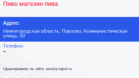 Пиво, магазин пива по адресу Нижегородская область, Павлово, Коммунистическая улица, 50 в дальнейшем Организация, размещена в следующих категориях: