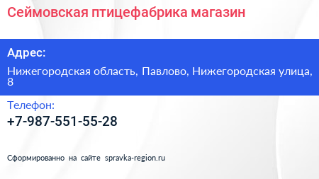 Сеймовская птицефабрика, магазин по адресу Нижегородская область, Павлово, Нижегородская улица, 8 в дальнейшем Организация, размещена в следующих категориях: