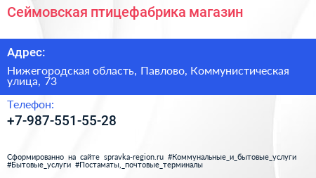 Сеймовская птицефабрика, магазин по адресу Нижегородская область, Павлово, Коммунистическая улица, 73 в дальнейшем Организация, размещена в следующих категориях: