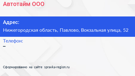 Автотайм, ООО по адресу Нижегородская область, Павлово, Вокзальная улица, 52 в дальнейшем Организация, размещена в следующих категориях: