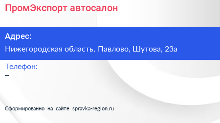 ПромЭкспорт, автосалон по адресу Нижегородская область, Павлово, Шутова, 23а в дальнейшем Организация, размещена в следующих категориях: