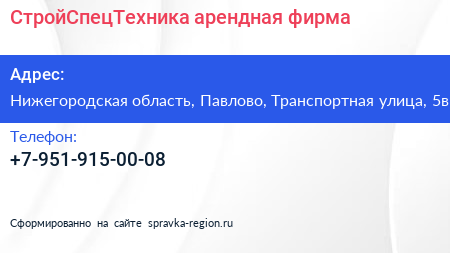 СтройСпецТехника, арендная фирма по адресу Нижегородская область, Павлово, Транспортная улица, 5в в дальнейшем Организация, размещена в следующих категориях:
