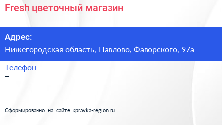 Fresh, цветочный магазин по адресу Нижегородская область, Павлово, Фаворского, 97а в дальнейшем Организация, размещена в следующих категориях: