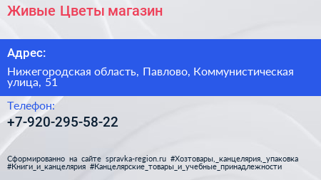 Живые Цветы, магазин по адресу Нижегородская область, Павлово, Коммунистическая улица, 51 в дальнейшем Организация, размещена в следующих категориях: