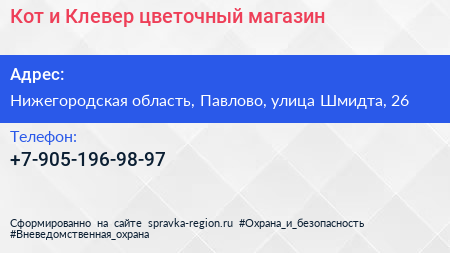Кот и Клевер, цветочный магазин по адресу Нижегородская область, Павлово, улица Шмидта, 26 в дальнейшем Организация, размещена в следующих категориях:
