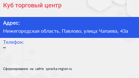 Куб, торговый центр по адресу Нижегородская область, Павлово, улица Чапаева, 43а в дальнейшем Организация, размещена в следующих категориях: