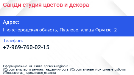 СанДи, студия цветов и декора по адресу Нижегородская область, Павлово, улица Фрунзе, 2 в дальнейшем Организация, размещена в следующих категориях: