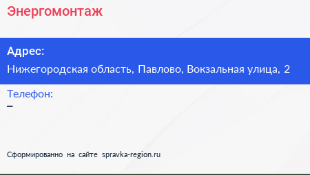 Энергомонтаж по адресу Нижегородская область, Павлово, Вокзальная улица, 2 в дальнейшем Организация, размещена в следующих категориях: