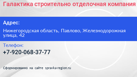 Галактика, строительно-отделочная компания по адресу Нижегородская область, Павлово, Железнодорожная улица, 42 в дальнейшем Организация, размещена в следующих категориях: