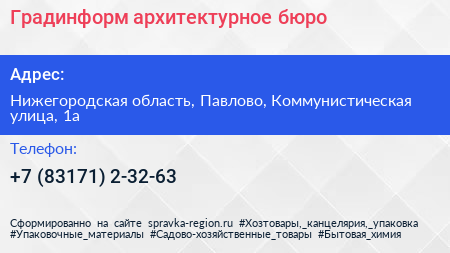 Градинформ, архитектурное бюро по адресу Нижегородская область, Павлово, Коммунистическая улица, 1а в дальнейшем Организация, размещена в следующих категориях: