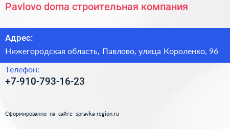 Pavlovo-doma, строительная компания по адресу Нижегородская область, Павлово, улица Короленко, 96 в дальнейшем Организация, размещена в следующих категориях: