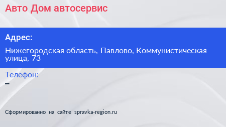 Авто Дом, автосервис по адресу Нижегородская область, Павлово, Коммунистическая улица, 73 в дальнейшем Организация, размещена в следующих категориях: