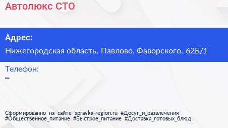 Автолюкс, СТО по адресу Нижегородская область, Павлово, Фаворского, 62Б/1 в дальнейшем Организация, размещена в следующих категориях: