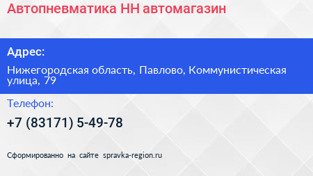 Автопневматика-НН, автомагазин по адресу Нижегородская область, Павлово, Коммунистическая улица, 79 в дальнейшем Организация, размещена в следующих категориях: