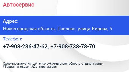 Автосервис по адресу Нижегородская область, Павлово, улица Кирова, 5 в дальнейшем Организация, размещена в следующих категориях: