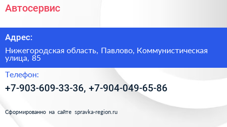 Автосервис по адресу Нижегородская область, Павлово, Коммунистическая улица, 85 в дальнейшем Организация, размещена в следующих категориях: