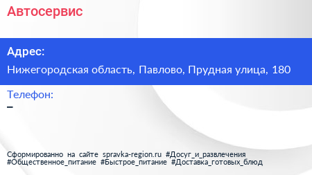 Автосервис по адресу Нижегородская область, Павлово, Прудная улица, 180 в дальнейшем Организация, размещена в следующих категориях: