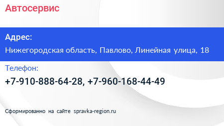 Автосервис по адресу Нижегородская область, Павлово, Линейная улица, 18 в дальнейшем Организация, размещена в следующих категориях: