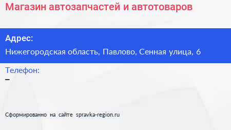 Магазин автозапчастей и автотоваров по адресу Нижегородская область, Павлово, Сенная улица, 6 в дальнейшем Организация, размещена в следующих категориях: