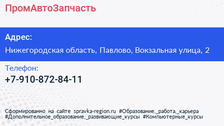 ПромАвтоЗапчасть по адресу Нижегородская область, Павлово, Вокзальная улица, 2 в дальнейшем Организация, размещена в следующих категориях: