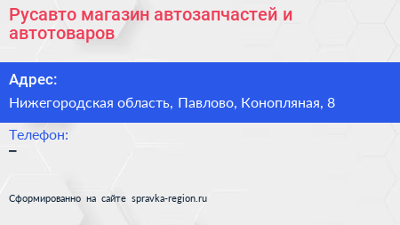 Русавто, магазин автозапчастей и автотоваров по адресу Нижегородская область, Павлово, Конопляная, 8 в дальнейшем Организация, размещена в следующих категориях: