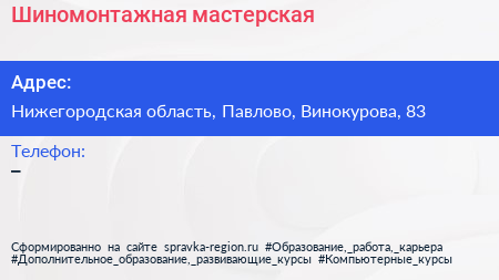 Шиномонтажная мастерская по адресу Нижегородская область, Павлово, Винокурова, 83 в дальнейшем Организация, размещена в следующих категориях: