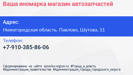 Ваша иномарка, магазин автозапчастей по адресу Нижегородская область, Павлово, Шутова, 11 в дальнейшем Организация, размещена в следующих категориях:
