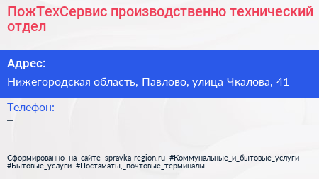 ПожТехСервис, производственно-технический отдел по адресу Нижегородская область, Павлово, улица Чкалова, 41 в дальнейшем Организация, размещена в следующих категориях: