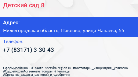 Детский сад №8 по адресу Нижегородская область, Павлово, улица Чапаева, 55 в дальнейшем Организация, размещена в следующих категориях: