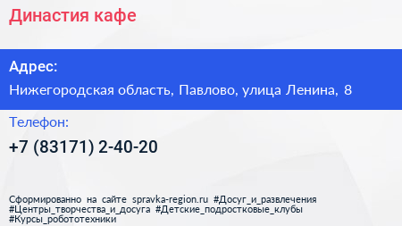 Династия, кафе по адресу Нижегородская область, Павлово, улица Ленина, 8 в дальнейшем Организация, размещена в следующих категориях: