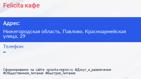 Felicita, кафе по адресу Нижегородская область, Павлово, Красноармейская улица, 29 в дальнейшем Организация, размещена в следующих категориях: