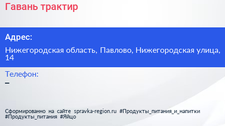 Гавань, трактир по адресу Нижегородская область, Павлово, Нижегородская улица, 14 в дальнейшем Организация, размещена в следующих категориях: