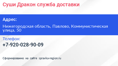Суши Дракон, служба доставки по адресу Нижегородская область, Павлово, Коммунистическая улица, 50 в дальнейшем Организация, размещена в следующих категориях: