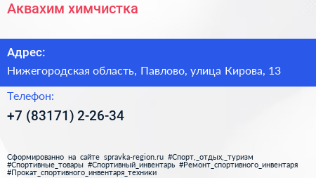 Аквахим, химчистка по адресу Нижегородская область, Павлово, улица Кирова, 13 в дальнейшем Организация, размещена в следующих категориях: