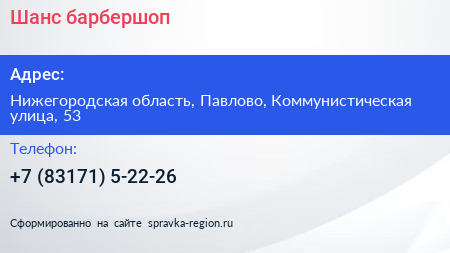 Шанс, барбершоп по адресу Нижегородская область, Павлово, Коммунистическая улица, 53 в дальнейшем Организация, размещена в следующих категориях: