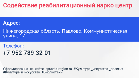 Содействие, реабилитационный нарко-центр по адресу Нижегородская область, Павлово, Коммунистическая улица, 17 в дальнейшем Организация, размещена в следующих категориях: