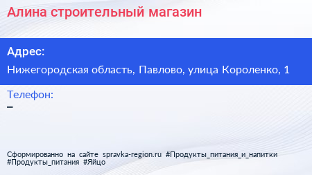 Алина, строительный магазин по адресу Нижегородская область, Павлово, улица Короленко, 1 в дальнейшем Организация, размещена в следующих категориях: