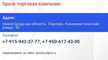 Space, торговая компания по адресу Нижегородская область, Павлово, Коммунистическая улица, 10 в дальнейшем Организация, размещена в следующих категориях: