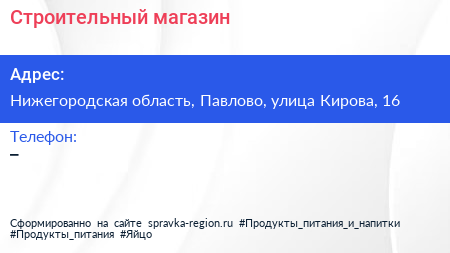 Строительный магазин по адресу Нижегородская область, Павлово, улица Кирова, 16 в дальнейшем Организация, размещена в следующих категориях: