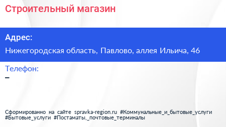 Строительный магазин по адресу Нижегородская область, Павлово, аллея Ильича, 46 в дальнейшем Организация, размещена в следующих категориях: