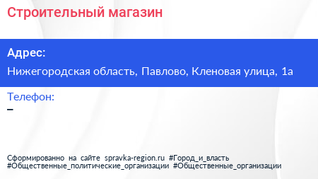 Строительный магазин по адресу Нижегородская область, Павлово, Кленовая улица, 1а в дальнейшем Организация, размещена в следующих категориях: