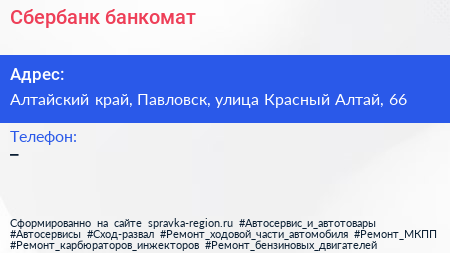 Сбербанк, банкомат по адресу Алтайский край, Павловск, улица Красный Алтай, 66 в дальнейшем Организация, размещена в следующих категориях: