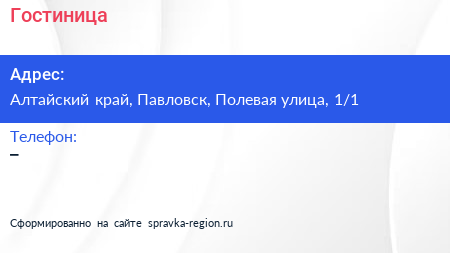 Гостиница по адресу Алтайский край, Павловск, Полевая улица, 1/1 в дальнейшем Организация, размещена в следующих категориях: