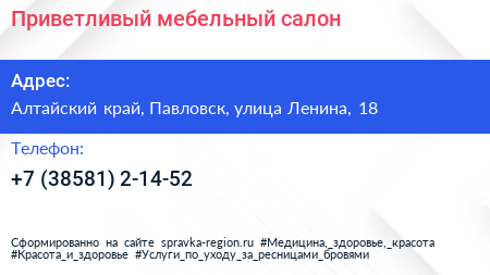 Приветливый, мебельный салон по адресу Алтайский край, Павловск, улица Ленина, 18 в дальнейшем Организация, размещена в следующих категориях: