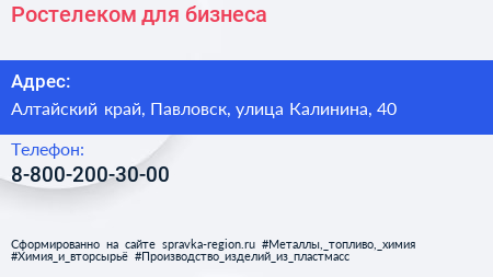 Ростелеком для бизнеса по адресу Алтайский край, Павловск, улица Калинина, 40 в дальнейшем Организация, размещена в следующих категориях: