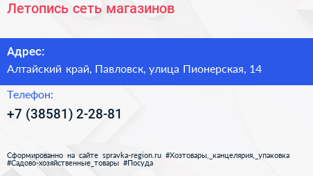 Летопись, сеть магазинов по адресу Алтайский край, Павловск, улица Пионерская, 14 в дальнейшем Организация, размещена в следующих категориях: