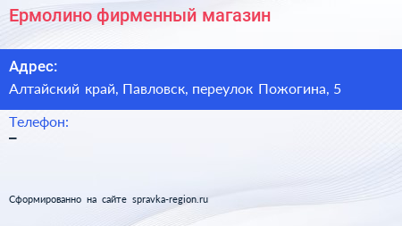 Ермолино, фирменный магазин по адресу Алтайский край, Павловск, переулок Пожогина, 5 в дальнейшем Организация, размещена в следующих категориях: