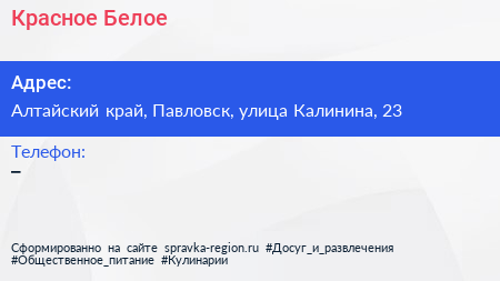 Красное&Белое по адресу Алтайский край, Павловск, улица Калинина, 23 в дальнейшем Организация, размещена в следующих категориях: