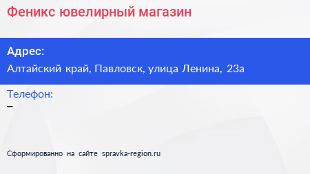 Феникс, ювелирный магазин по адресу Алтайский край, Павловск, улица Ленина, 23а в дальнейшем Организация, размещена в следующих категориях: