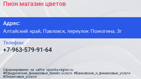 Пион, магазин цветов по адресу Алтайский край, Павловск, переулок Пожогина, 3г в дальнейшем Организация, размещена в следующих категориях: